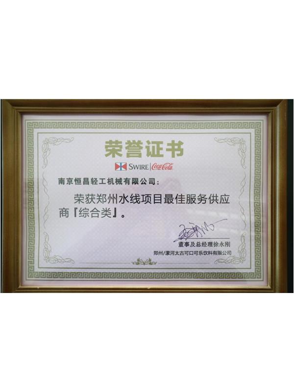 南京恒昌包裝作為后段整包商,在鄭州太古可口可樂48000bph水線項(xiàng)目中獲得“最佳服務(wù)供應(yīng)商”殊榮!